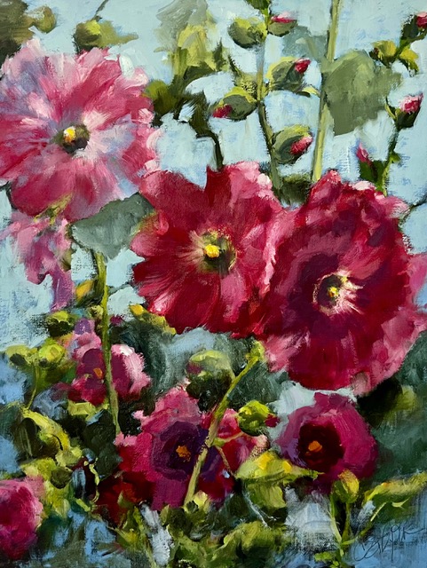 …”it’s always a challenge, never-ever routine. The changing light and weather conditions create a sense of urgency that translates to a spontaneous and loose interpretation of the scene.” Transporting structured chaos into the studio for the much larger pieces proves an undertaking Cheryl is well equipped to handle.