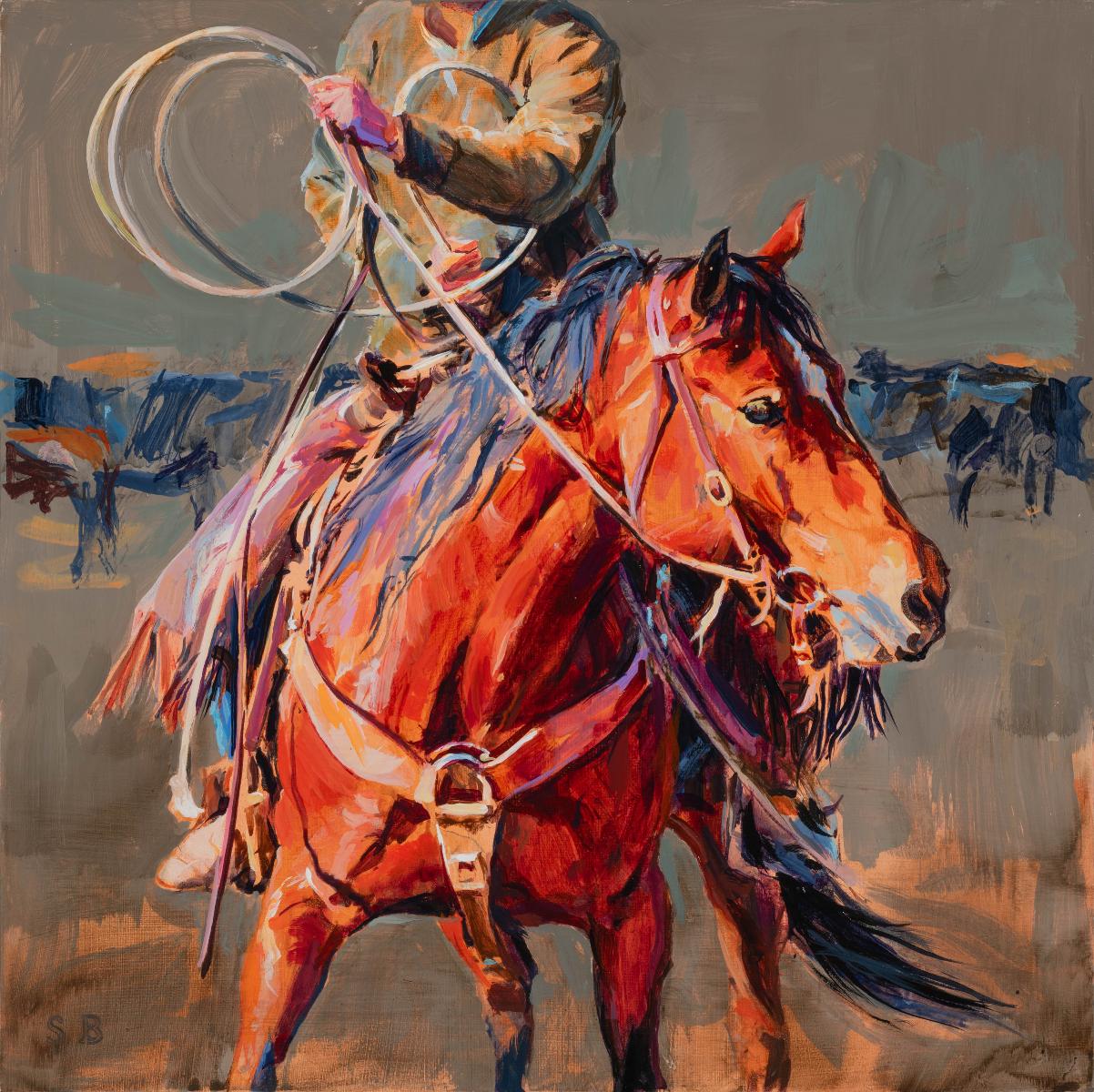 Head-spinning, hat-losing eight seconds of pure Americana. Sophy Brown dramatizes the rodeo life with hair-raising exactness using just ink, charcoal or acrylic. Sophy’s paintings of life on the road with rodeo horses ready to chase the barrels or depicting a cowboy looking for a soft landing stretched out over a bucking bronc gives the viewer a sense of living in the moment.