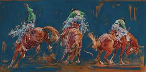 I hope my paintings capture " the feel of the rush of life." I want to show what it is like to be amongst horses in a great open country. I paint as a means of capturing and the blood and bone responses of the horse in images of speed, freedom, alarm, curiosity and exuberance. In the horse's alertness and physicality I recognize our common nature and a manifestation of what in us is often hidden and complicated. I find subjects at rodeos, the sporting show-biz remnants of a practical past. The bucking horse paintings show an adrenaline-born moment when both horse and rider are tapping into their primary resources. They are about hanging onto a rough ride and getting a threat off your back. They are about strength, balance and survival. A cowboy image refers to that forthright, self-reliant, frontier-broaching man who kicked American progress into high gear. It refers to living close to the rigors and rhythms of nature, a connection that has increasing value in a world that is getting smaller with easy communication, travel and the pursuit, not of "happiness", but convenience. As we are aware of the changes in the world, we are reminded also of our own deep and instinctive nature. The critic John Berger says that man looks at animals across an "abyss of non-comprehension" and vice versa: we have parallel lives. He says the "animal has secrets which, unlike the secrets of caves, mountains, seas, are specifically addressed to man." I was born in 1963 and grew up in England, coming to America in 1987 when I went to the University of Michigan to study for a MFA in painting. I had completed my BFA at Goldsmiths College of London University and was ready for a change of scene.