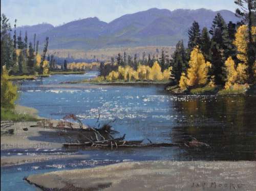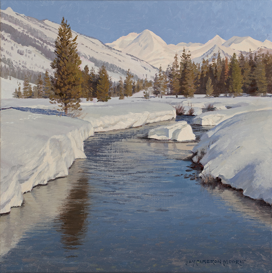 Jay Moore graduated in the top of his class at the Colorado Institute of Art in 1984, but his education started long before graduation, and well outside the classroom. Moore took a lifetime spent outdoors and funneled nature’s emotional impact on him down into his magnificent landscape works. Today his award- winning paintings are collected all around the country, and they are shown at some of the top galleries and museums. He frequently paints mountain landscapes including many that feature water elements, for which is he well known and respected, and also wildlife, which is a recent addition to his work. “While I paint many subjects, my affinity is mostly for Colorado. I’m a Colorado native, and it’s my upbringing there—from wading through streams to climbing mountains to hiking in its beautiful forests—that led me to where I am now,” Moore says. “When I’m outdoors I get inspired very easily and see subjects for new paintings everywhere.” His work is known for its delicate attention to detail and also the way he captures nature’s moods and nuance without sacrificing the epic scope that his work achieves with the grandeur of his subjects. “If you get up before dawn, you’re going to see things that will amaze you. And if you stay there until twilight and look closely enough you’ll see things that will astound you because they are so spectacular,” he says. “With every piece I’m just trying to capture the reverence of the land around me.”
