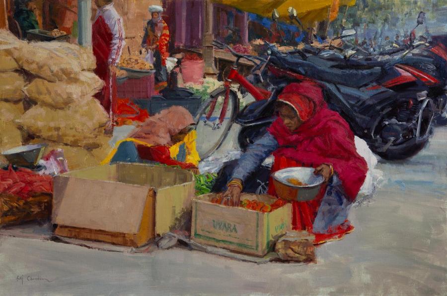 Rajasthani Women Waiting for a Bus" which recently won Raj an Honorable Mention Award at the 15th Annual American Impressionist Society's National Juried Show.