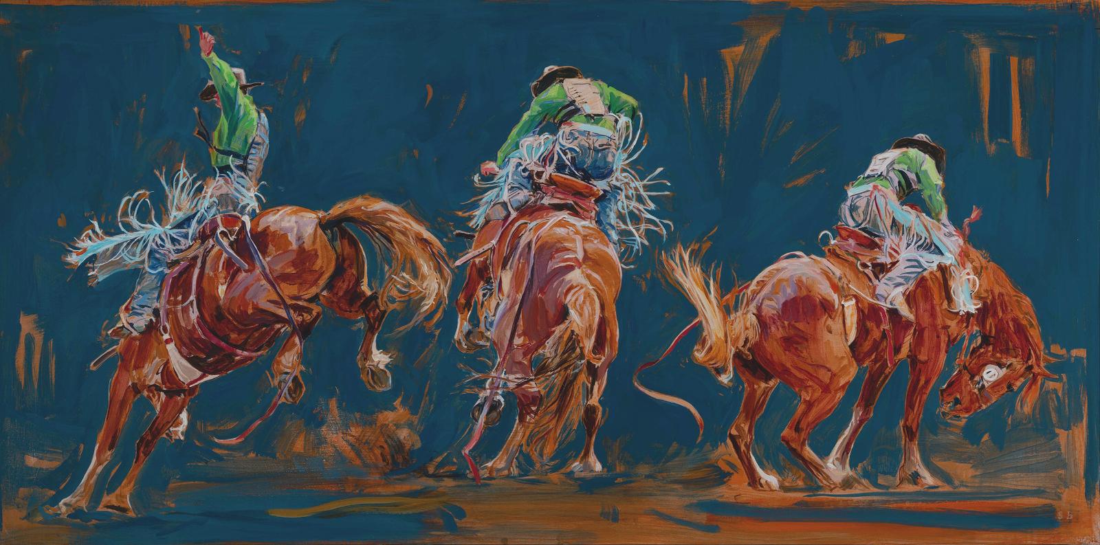 Head-spinning, hat-losing eight seconds of pure Americana. Sophy Brown dramatizes the rodeo life with hair-raising exactness using just ink, charcoal or acrylic. Sophy’s paintings of life on the road with rodeo horses ready to chase the barrels or depicting a cowboy looking for a soft landing stretched out over a bucking bronc gives the viewer a sense of living in the moment.